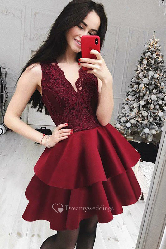 A-line Sleeveless Satin Lace V-neck Short Mini Homecoming Dress