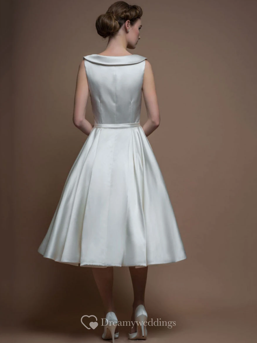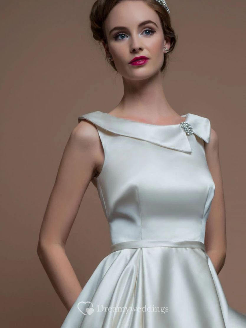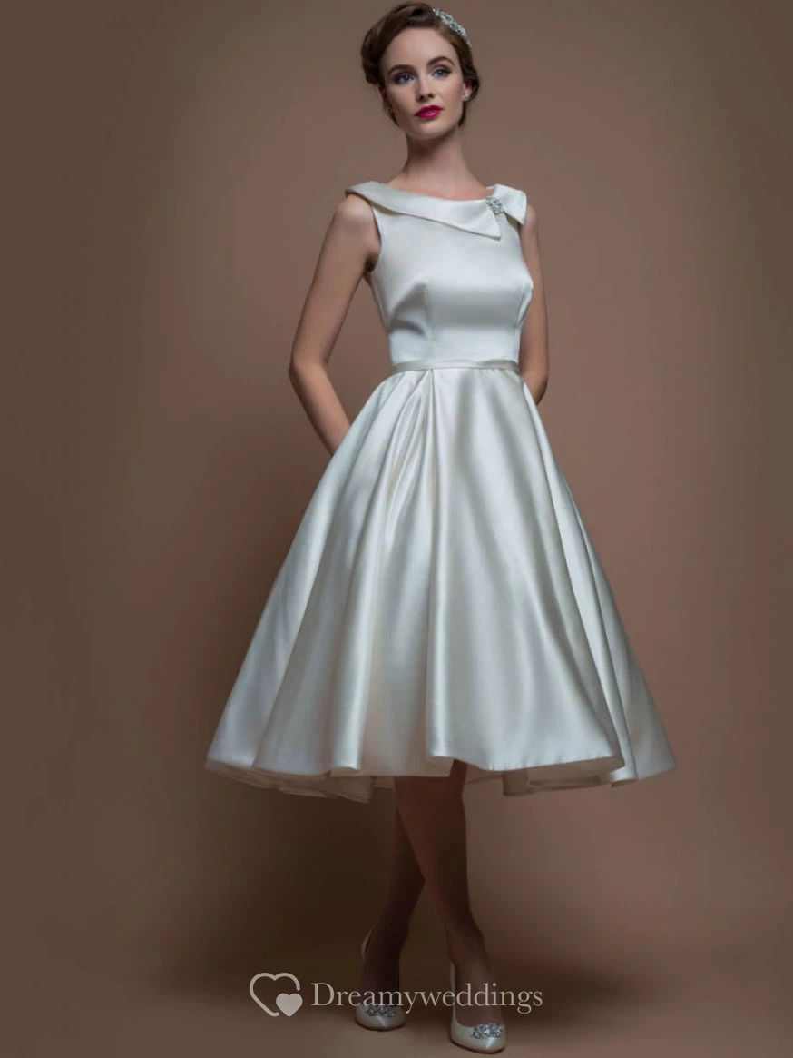 A-Line Sleeveless Tea-Length Bateau-Neck Satin Wedding Dress With Broach