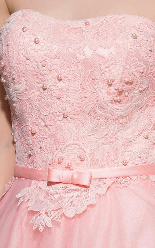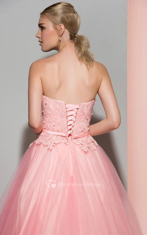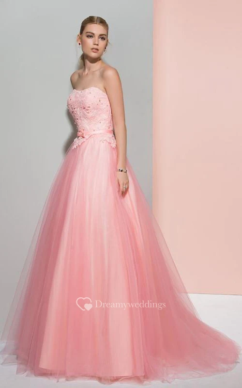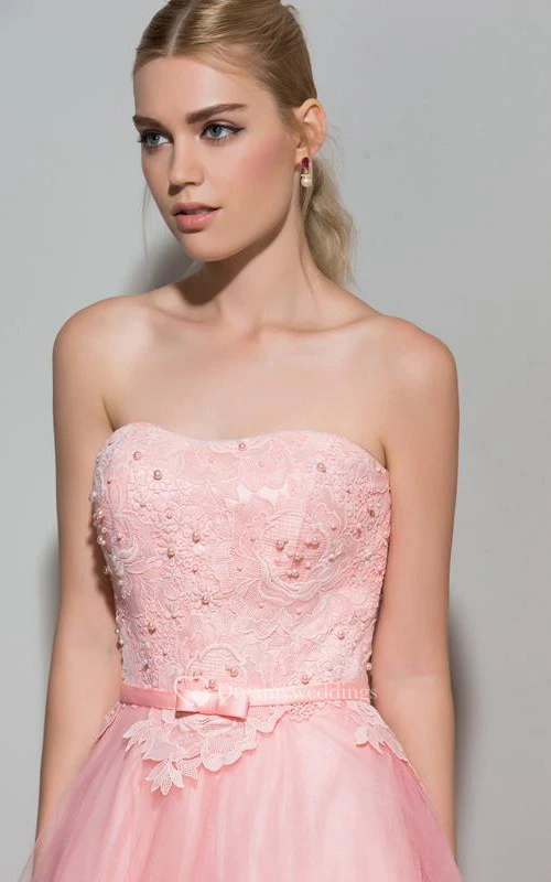 A-Line Strapless Beading Lace Sashes Sweep Train Prom Dress