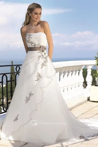 A-Line Strapless Floor-Length Appliqued Tulle Wedding Dress With Side Draping And Flower