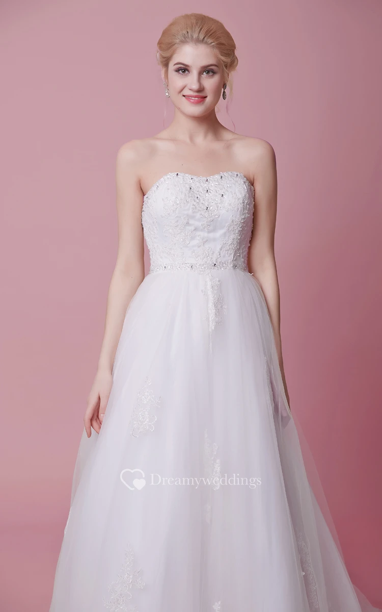A-Line Strapless Lace-Appliqued Tulle Dress With Beaded Bodice