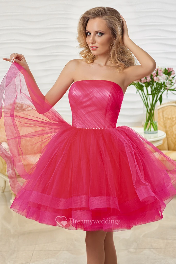 A Line Strapless Ruched Short Mini Sleeveless Tulle Prom Dress With Tiers