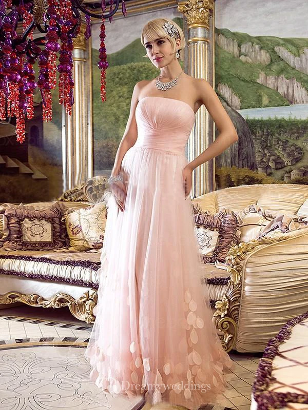A-line Strapless Sleeveless Floor-Length Tulle Applique Dresses