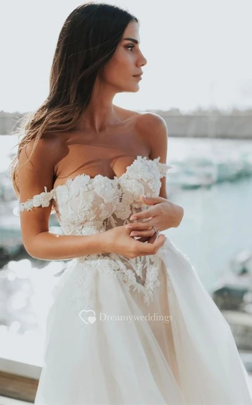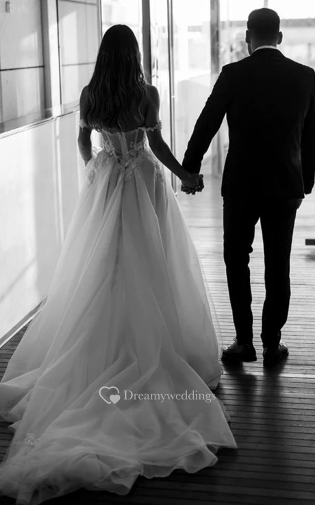 A Line Stunning Tulle Off-the-shoulder Chapel Train Wedding Dress