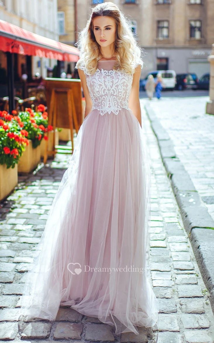 A-Line Sweep Bateau Short Sleeve Tulle Pleats Appliques Low-V Back Dress