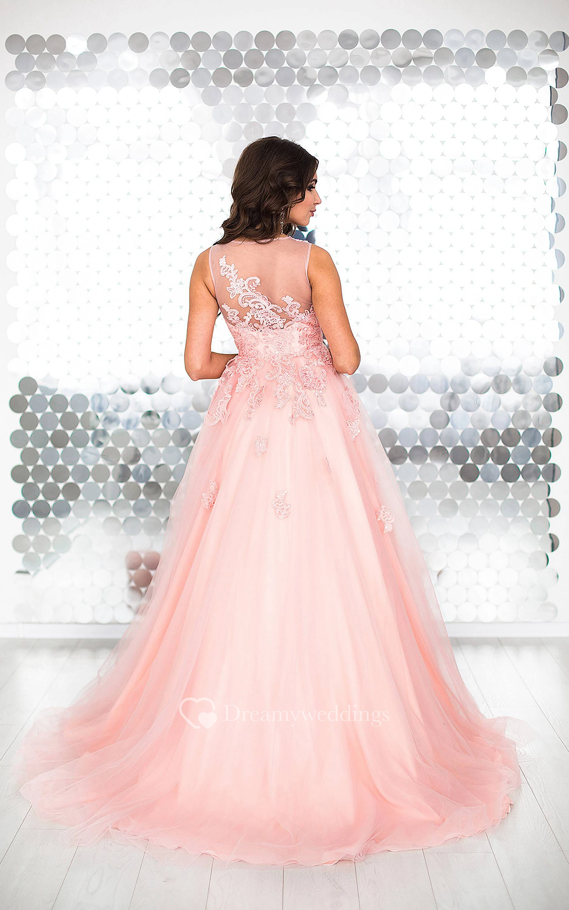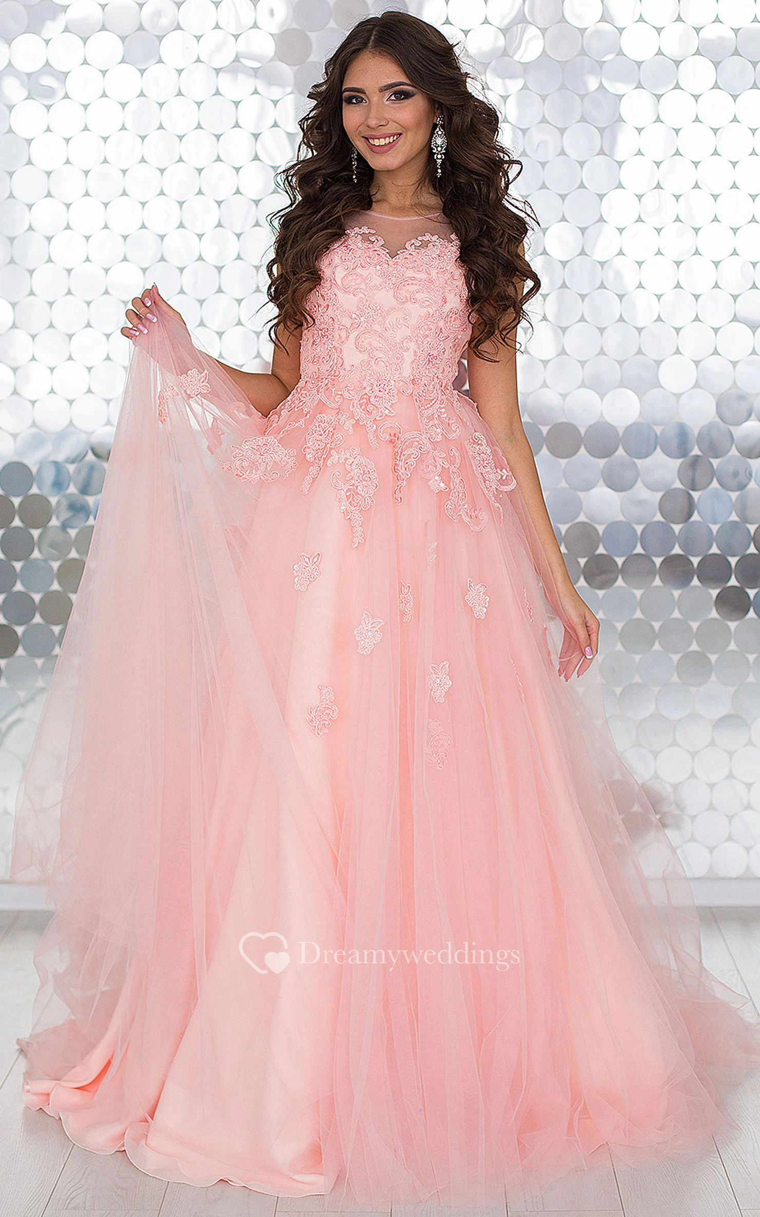 A-Line Sweep Bateau Sleeveless Tulle Pleats Appliques Illusion Dress