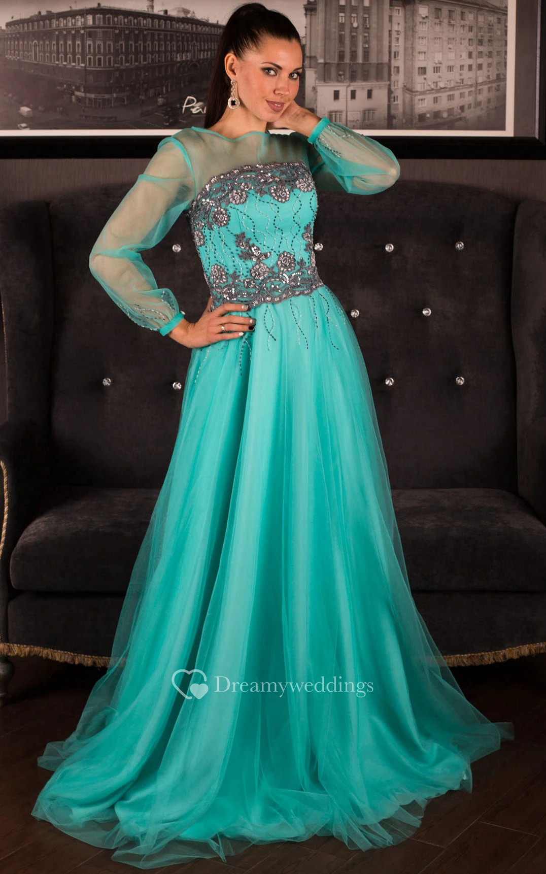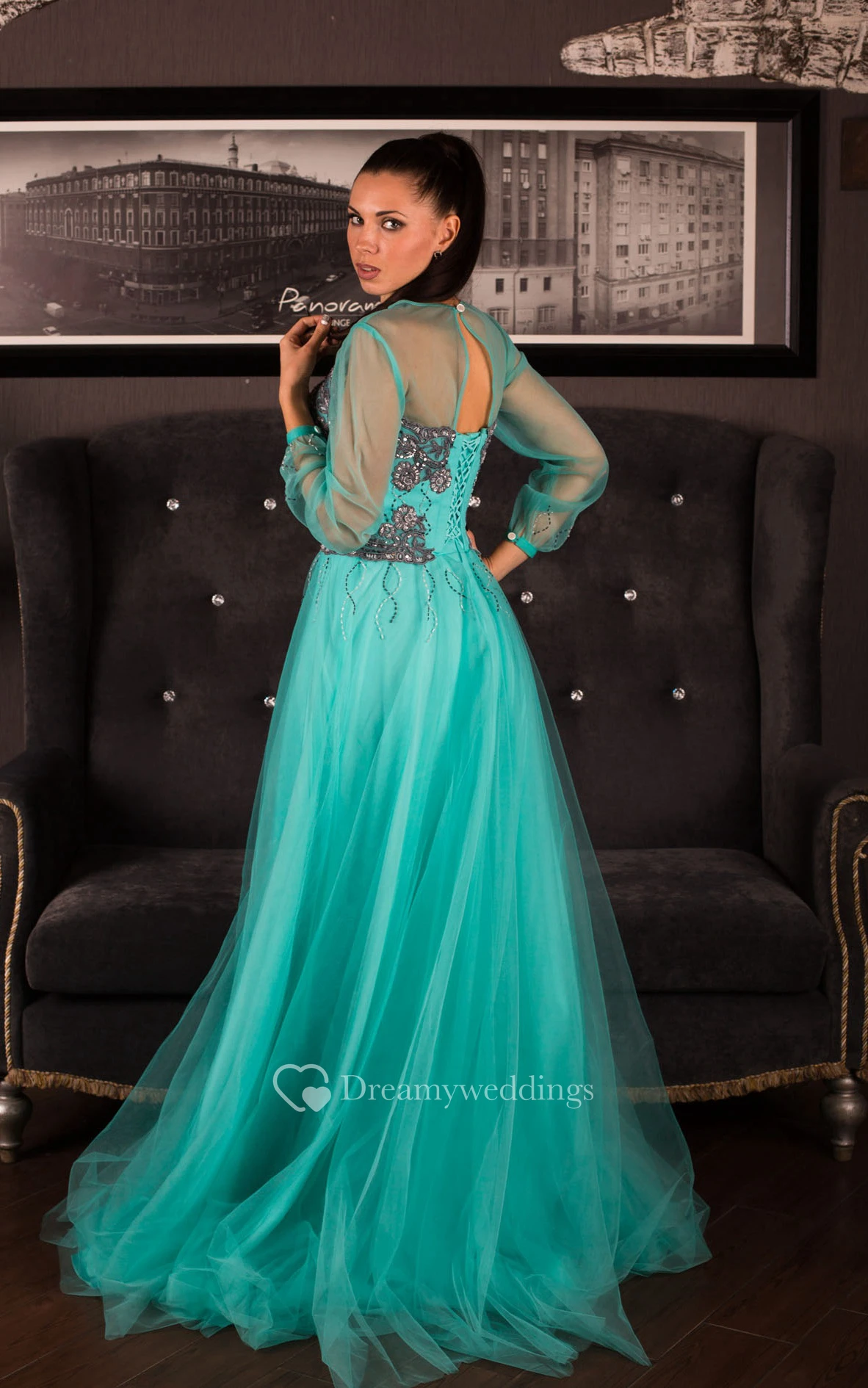 A-Line Sweep High-Neck Long Sleeve Tulle Appliques Beading Keyhole Dress