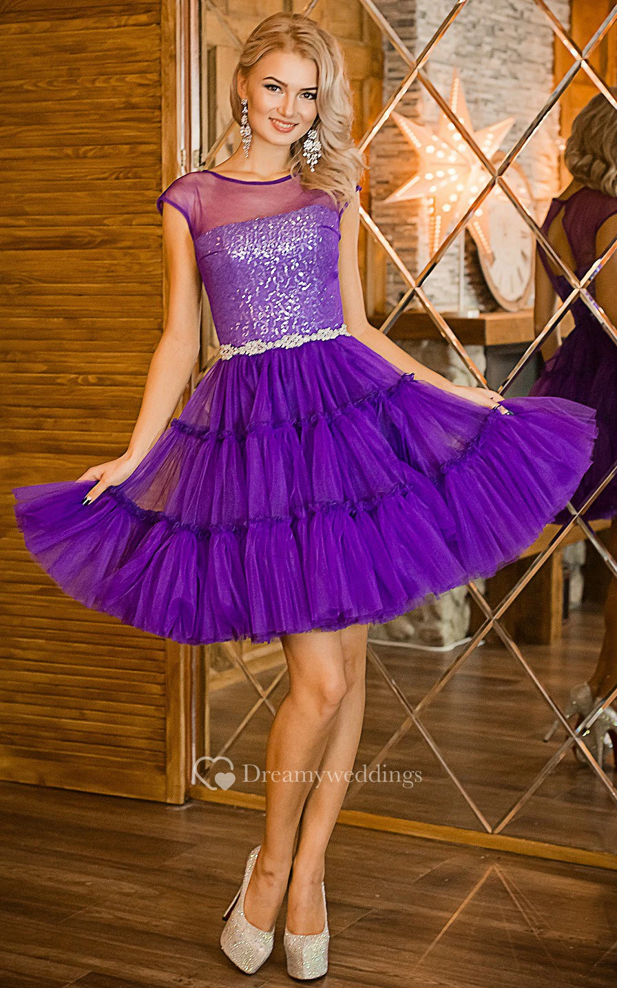 A-Line Sweep High-Neck Short Sleeve Satin Appliques Beading Illusion Dress