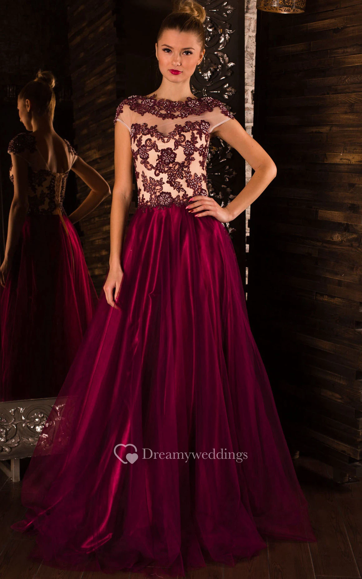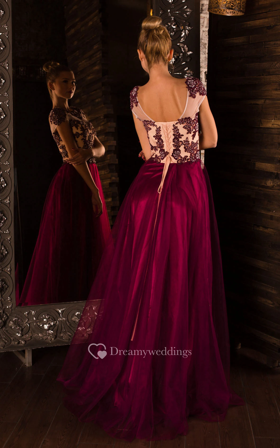 A-Line Sweep High-Neck Short Sleeve Tulle Beading Appliques Lace-Up Dress