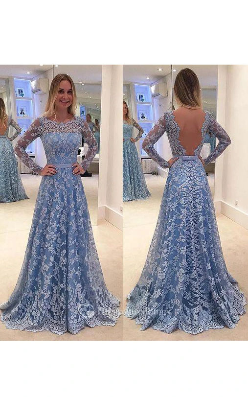 A-line Sweep Train Appliques Lace Deep V Back Dress