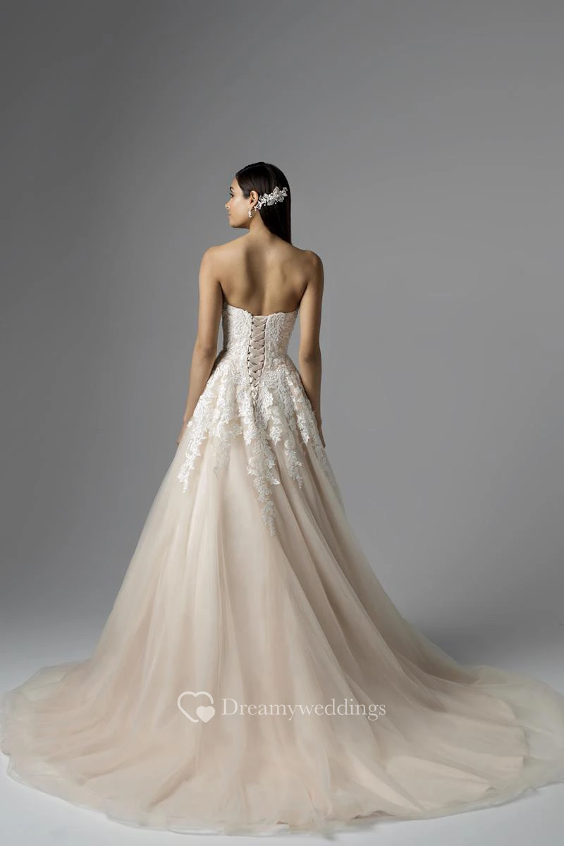 The lace and tulle fabric is so beautiful!! The band design on the back also allows me to adjust the size without having to go to a tailor!! What a perfect dress!! My wedding is going to be perfect!