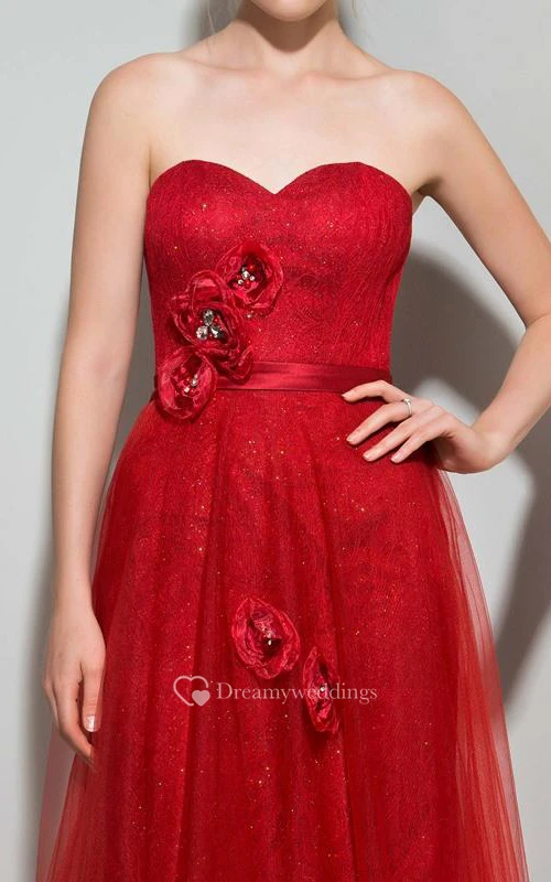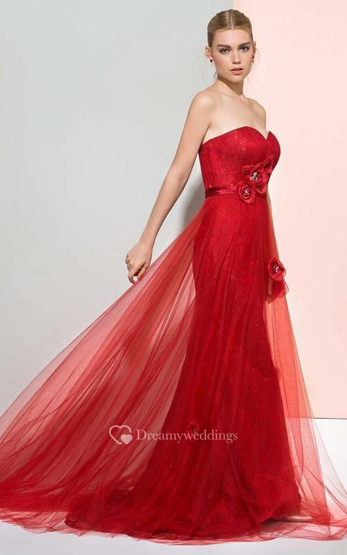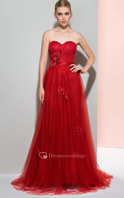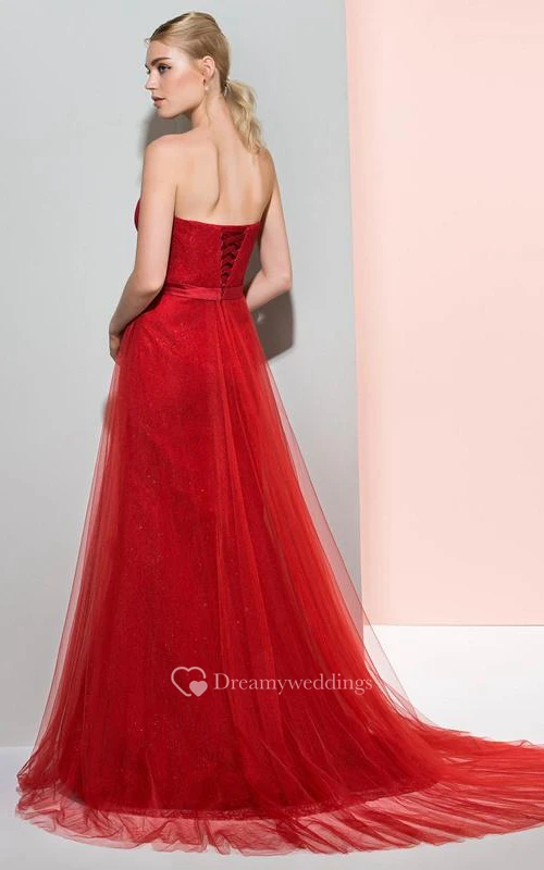 A-Line Sweetheart Beading Crystal Court Train Prom Dress