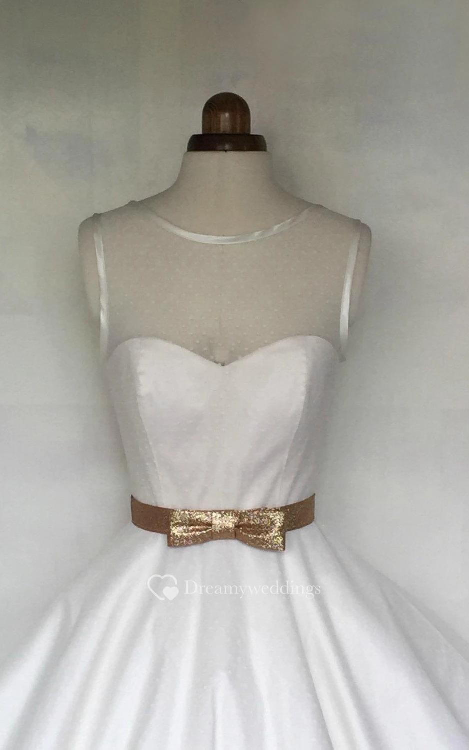 A-Line Tea Length Jewel Neck Dress With Bow Sash and Illusion Top