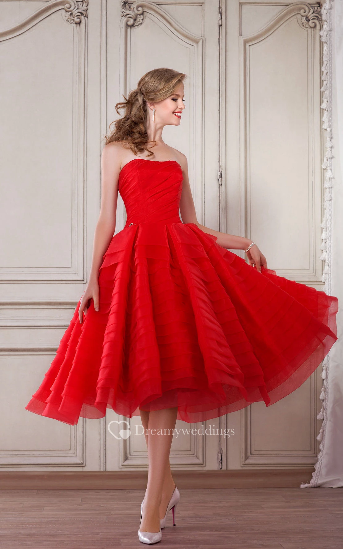 A-Line Tea-Length Strapless Sleeveless Organza Ruching Pleats Zipper Dress