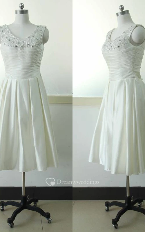 A-Line Tea-Length V-Neck Sleeveless Beading Flower Zipper Corset Back Chiffon Tulle Lace Sequins Satin Dress