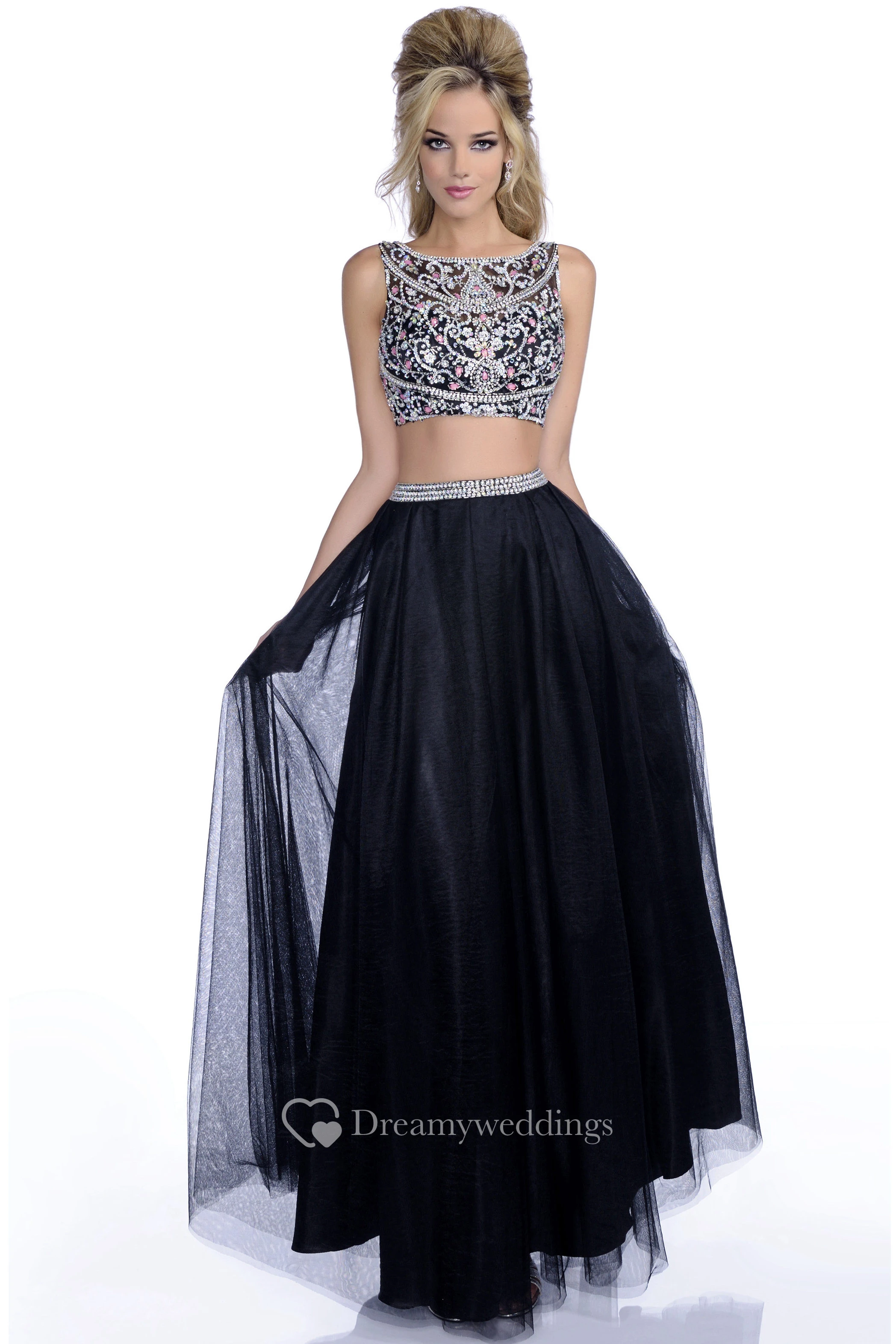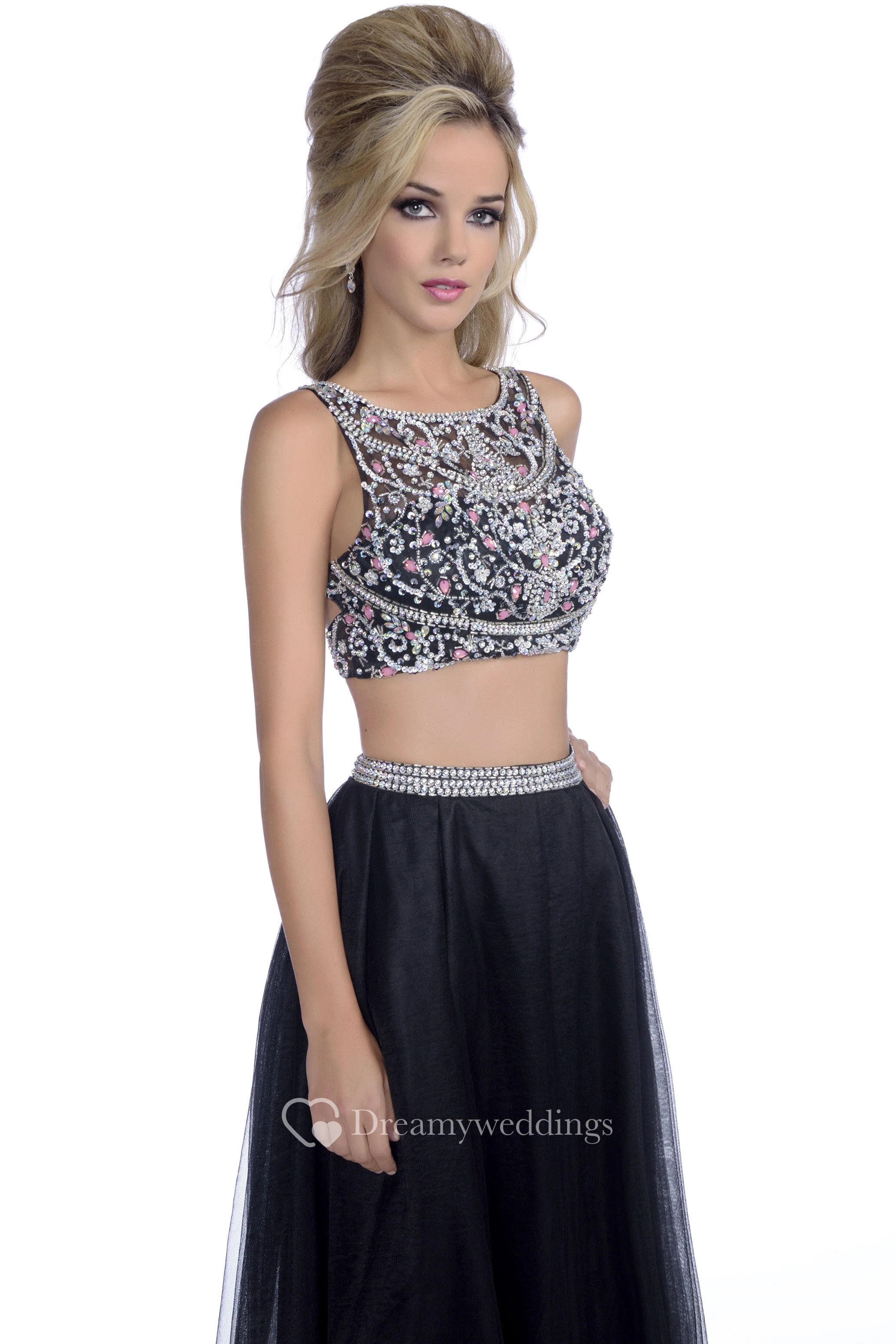 A-Line Tulle Crop Top Bateau Neck Sleeveless Prom Dress With Jeweled Bodice