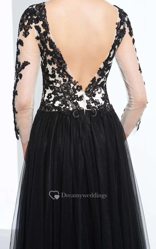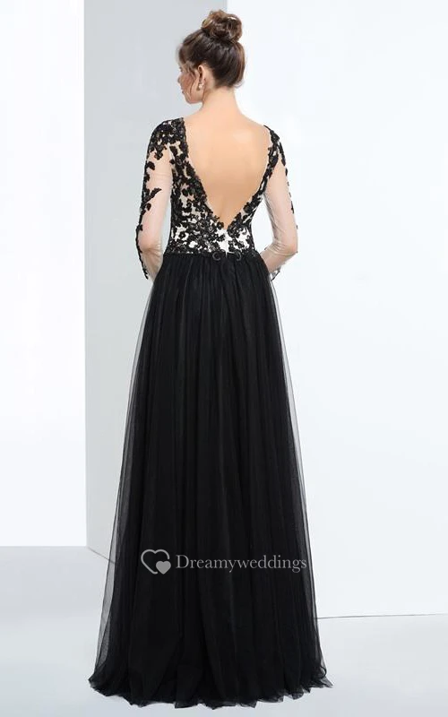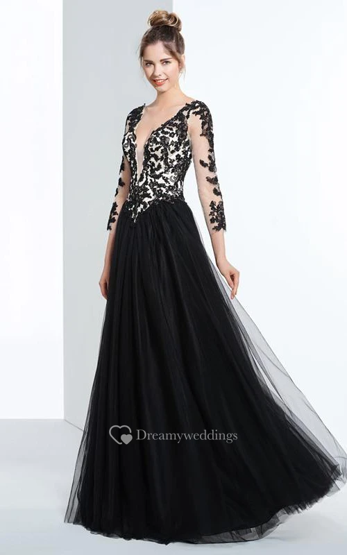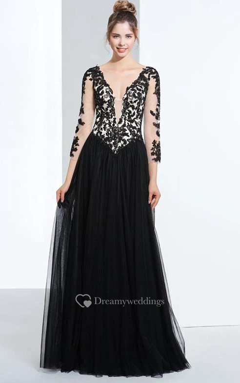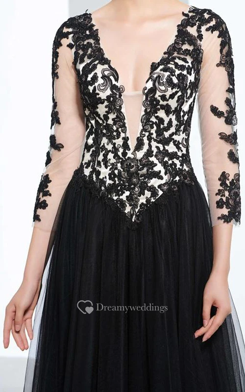A-Line V-Neck 3-4 Length Sleeves Appliques Beading Prom Dress