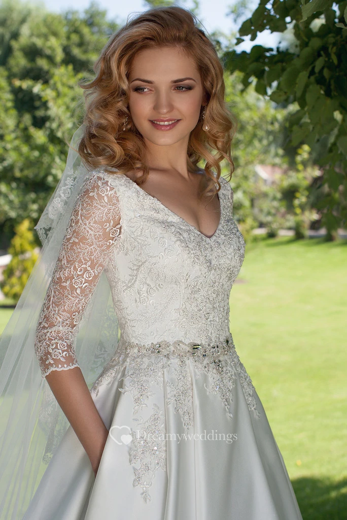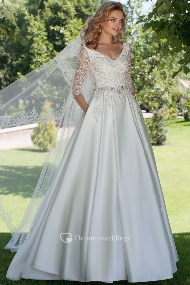 A-Line V-Neck Appliqued 3-4 Sleeve Satin Wedding Dress
