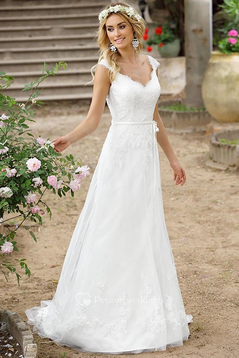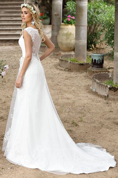 A-Line V-Neck Cap-Sleeve Lace Wedding Dress With Illusion