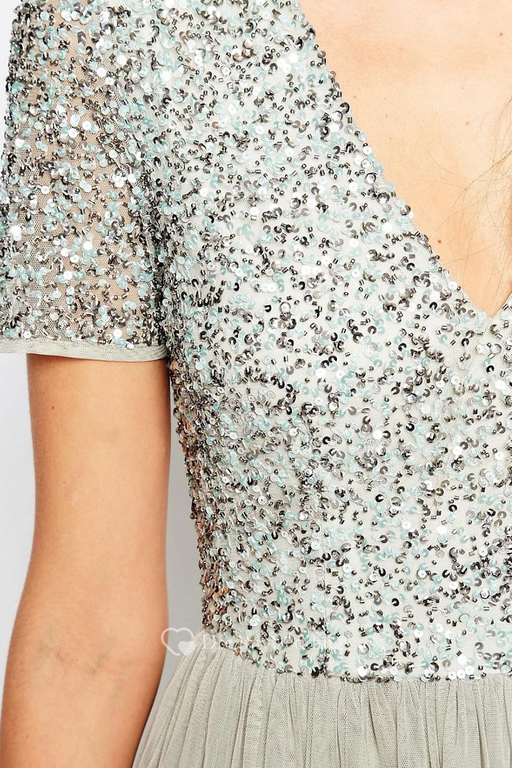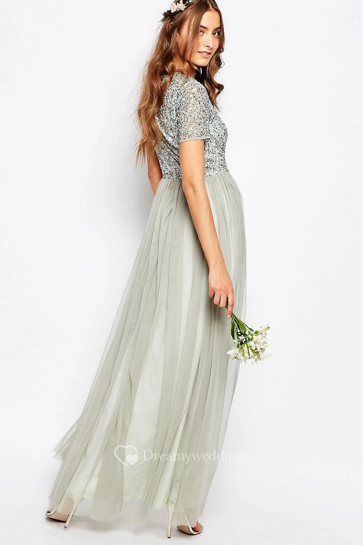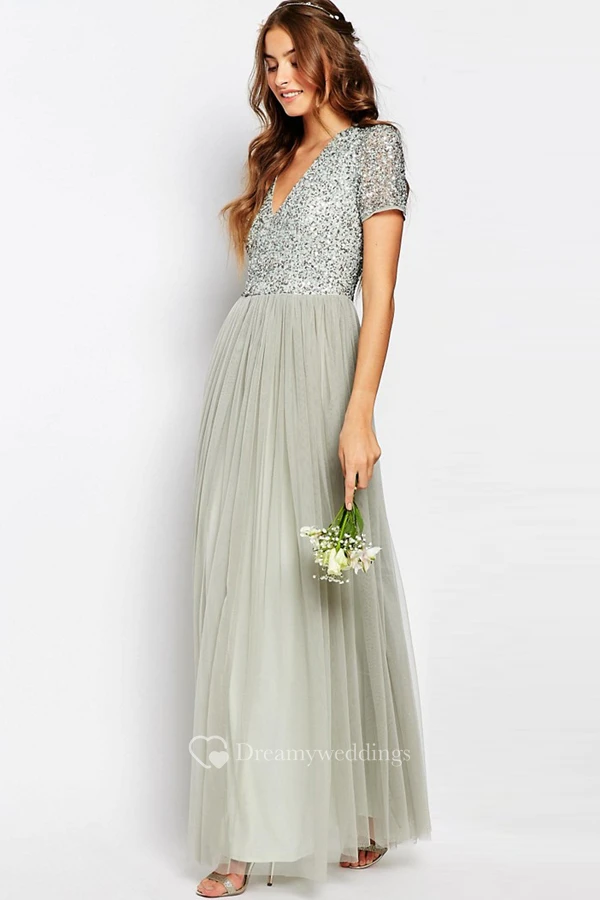 A-Line V-Neck Floor-Length Beaded Short-Sleeve Chiffon Bridesmaid Dress With Pleats