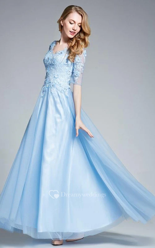 A-Line V-Neck Half Sleeves Appliques Beading Prom Dress