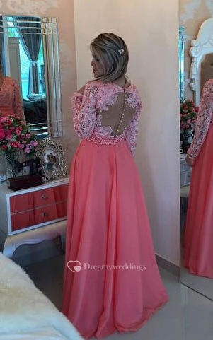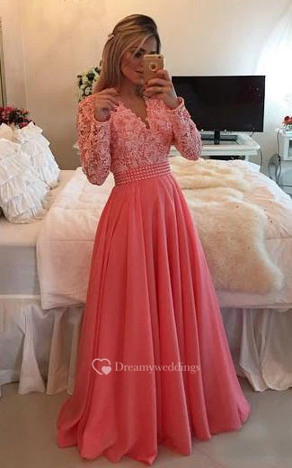 A-line V-neck Long Sleeve Beading Appliques Chiffon Lace Dress