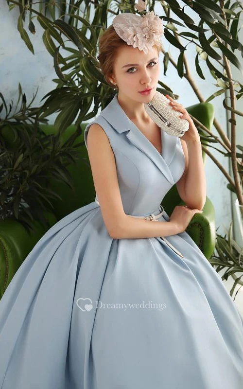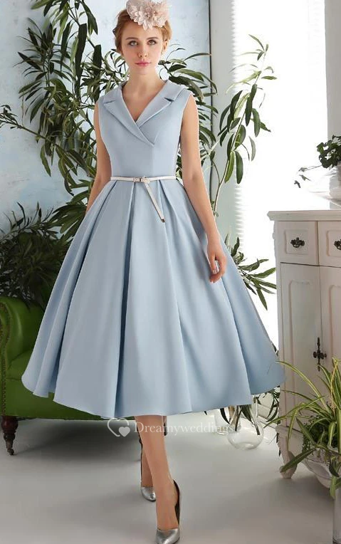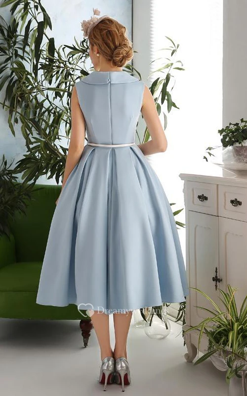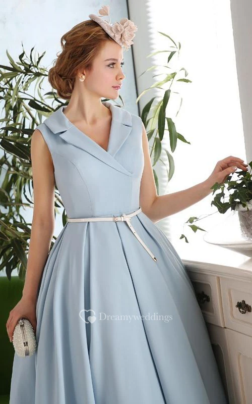 A-Line V-Neck Sashes Tea-Length Prom Dress
