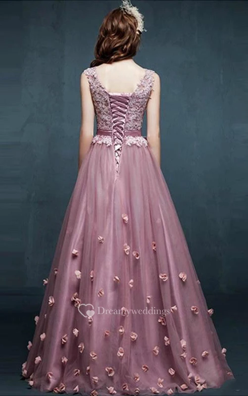 A-line V-neck Sleeveless Appliques Flower Tulle Dress