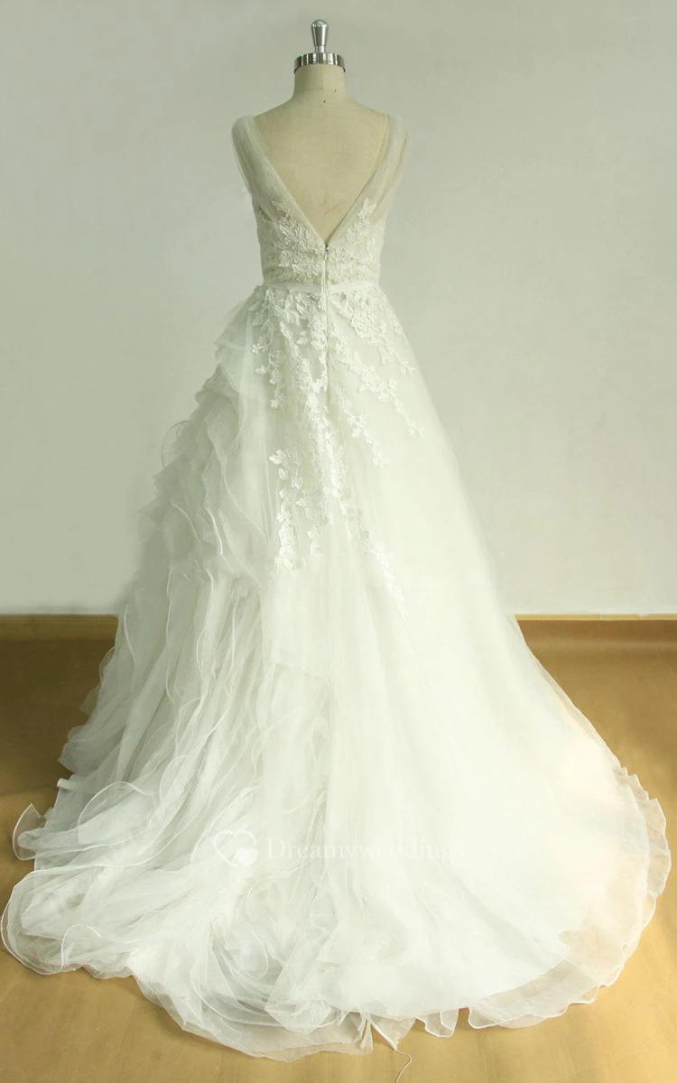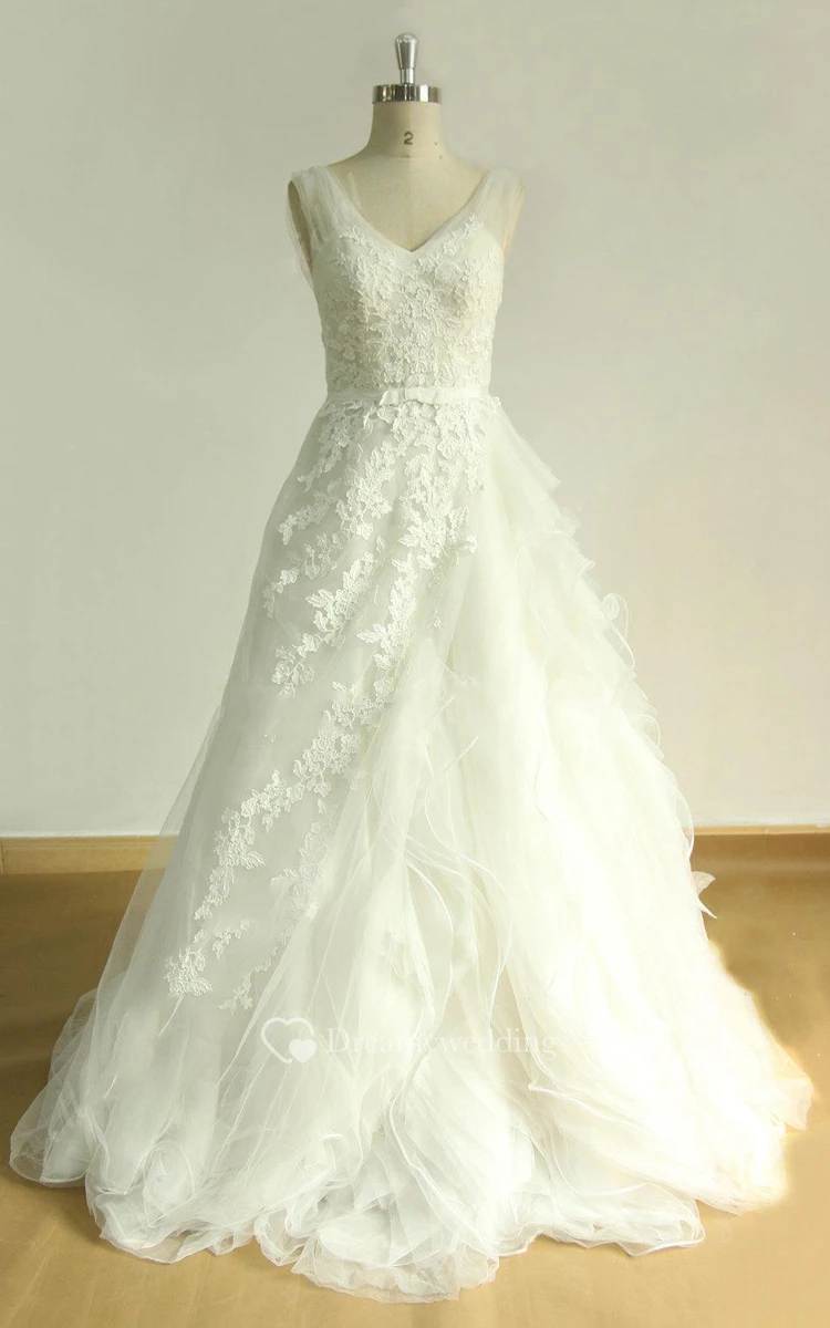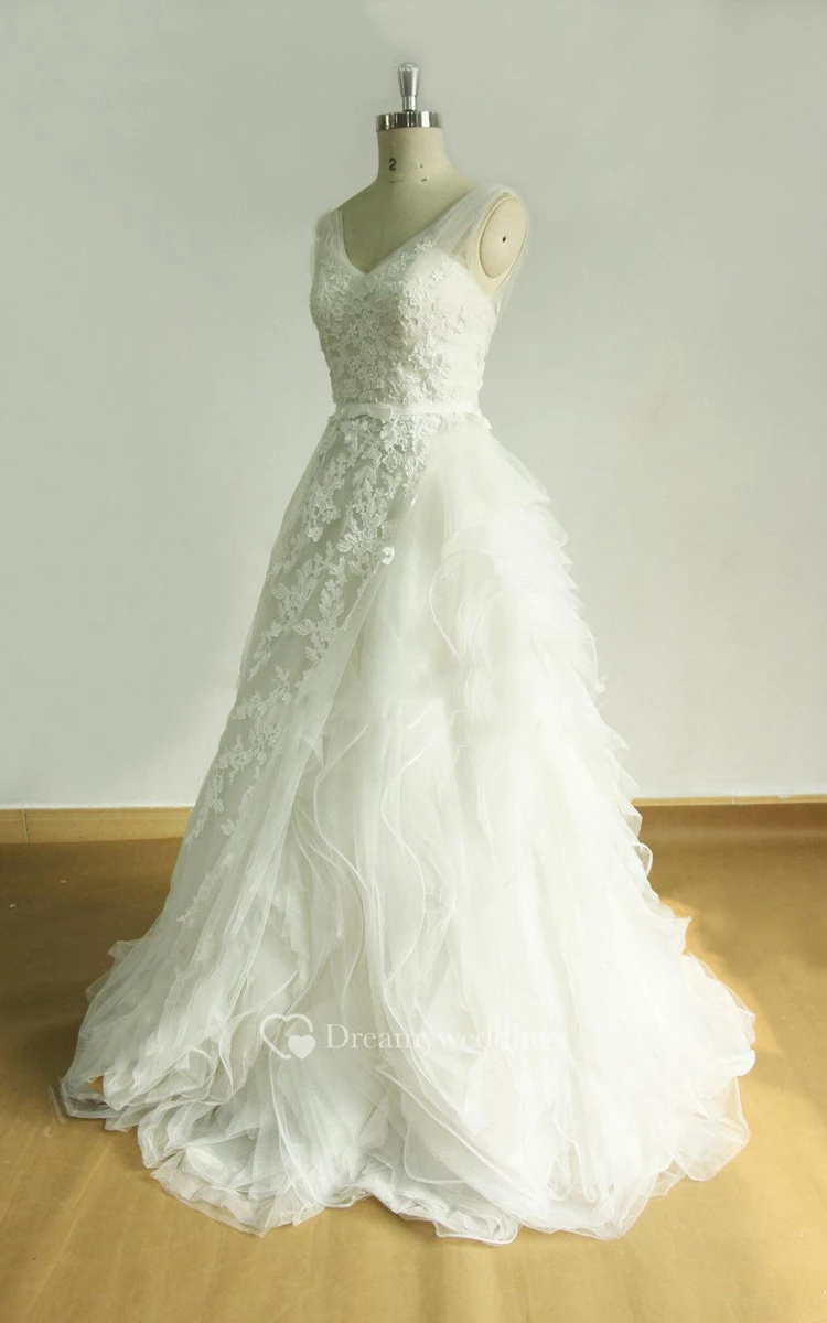 A-Line V-Neck Tulle Lace Satin Weddig Dress With Ruffles