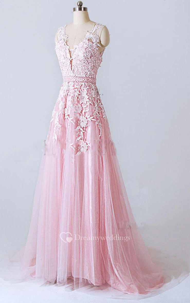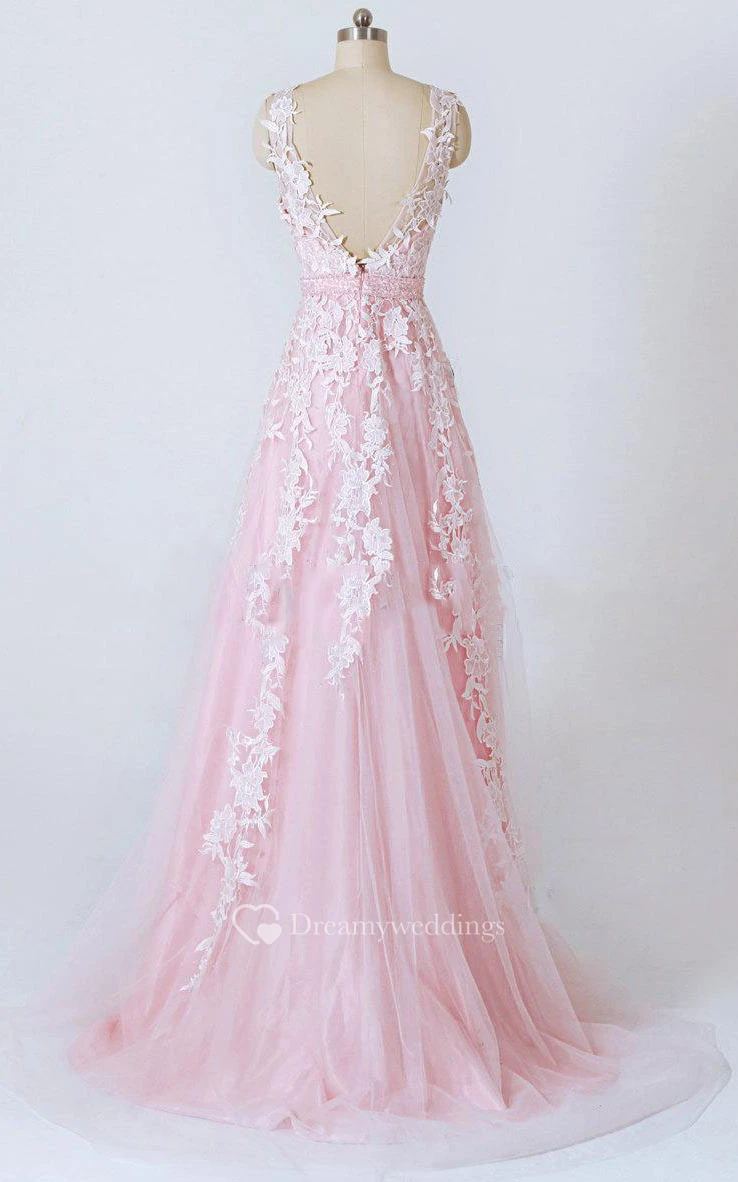 A-line V-neck Tulle And Lace Dress With Appliques And Low V back