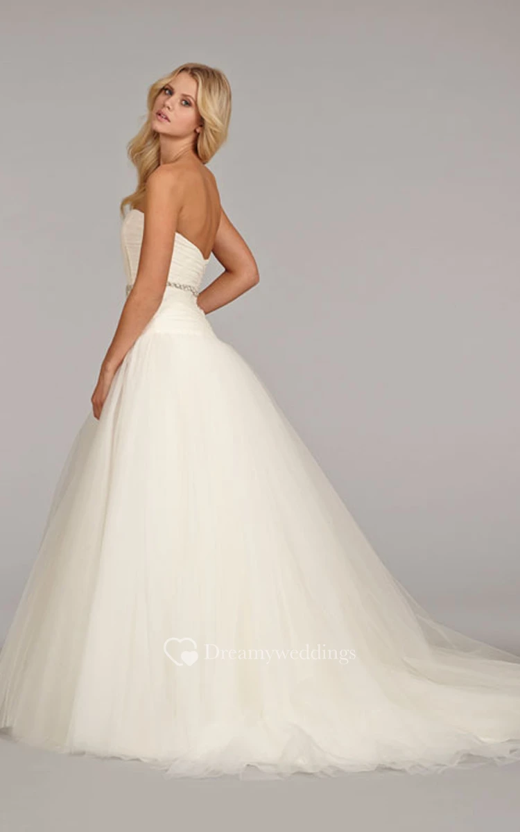Alluring Strapless Ruched Bodice Tulle Ball Gown With Beaded Belt