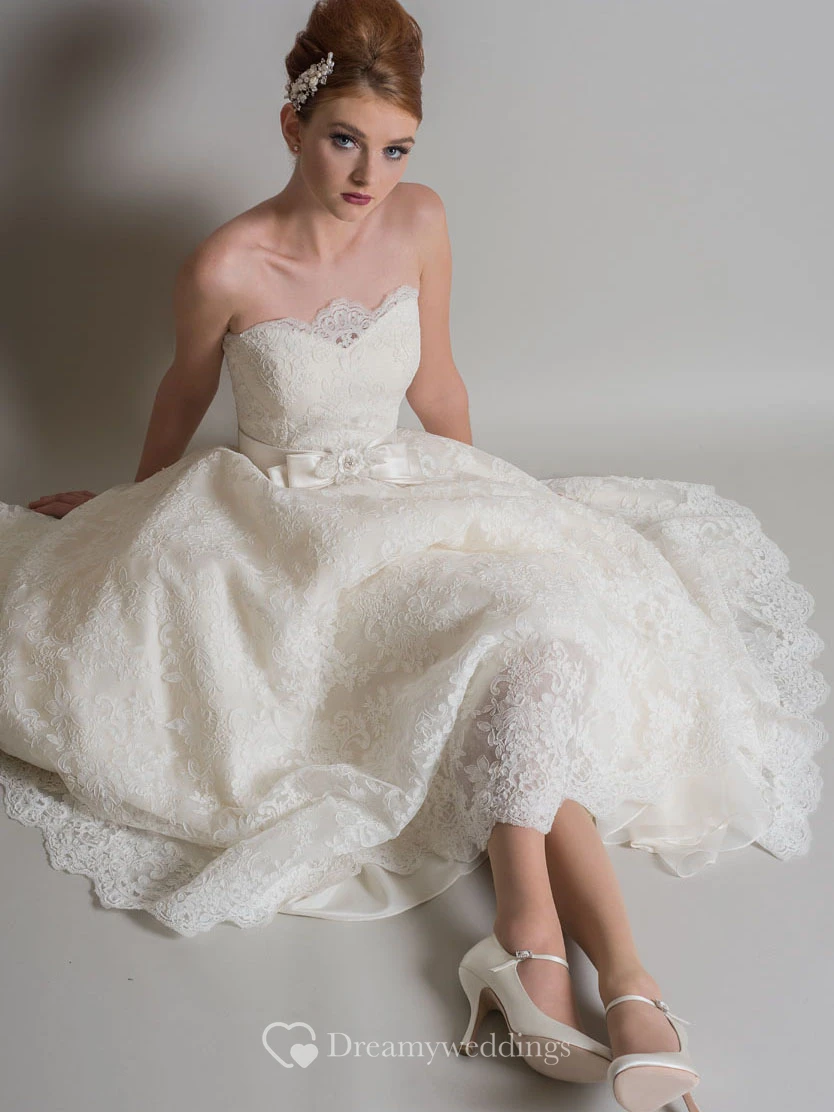 Ankle-Length A-Line Appliqued Strapless Lace Wedding Dress With Bow