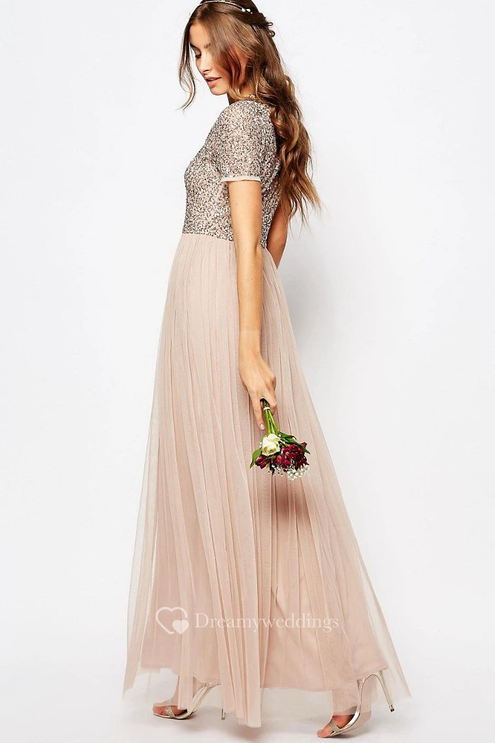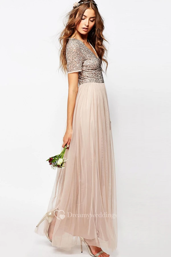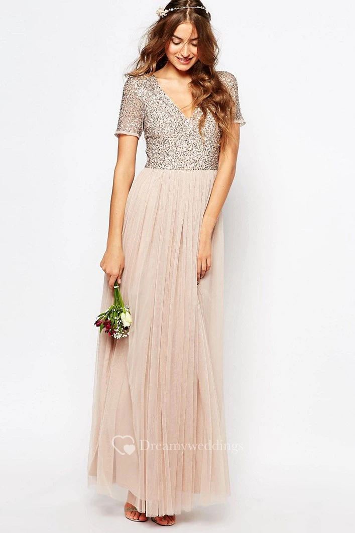 Ankle-Length V-Neck Sequined Short Sleeve Tulle Bridesmaid Dress With Pleats