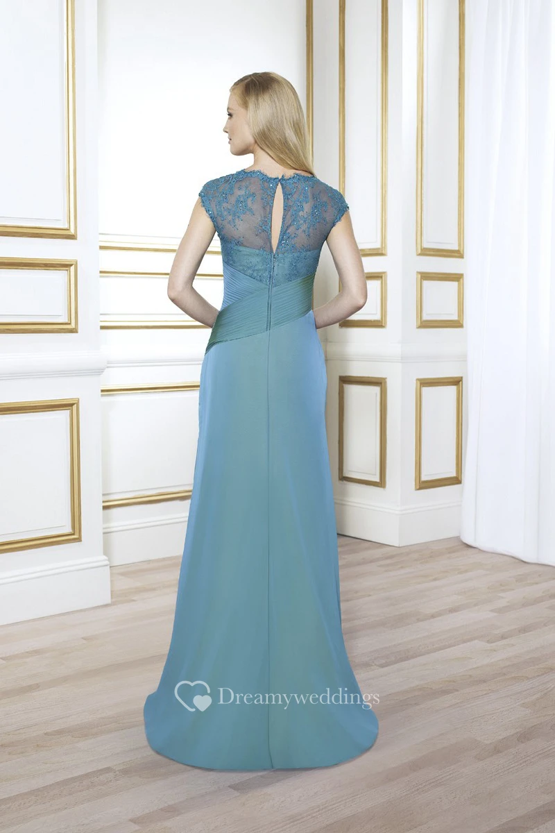 Appliqued Floor-Length Cap-Sleeve V-Neck Satin Formal Dress With Draping