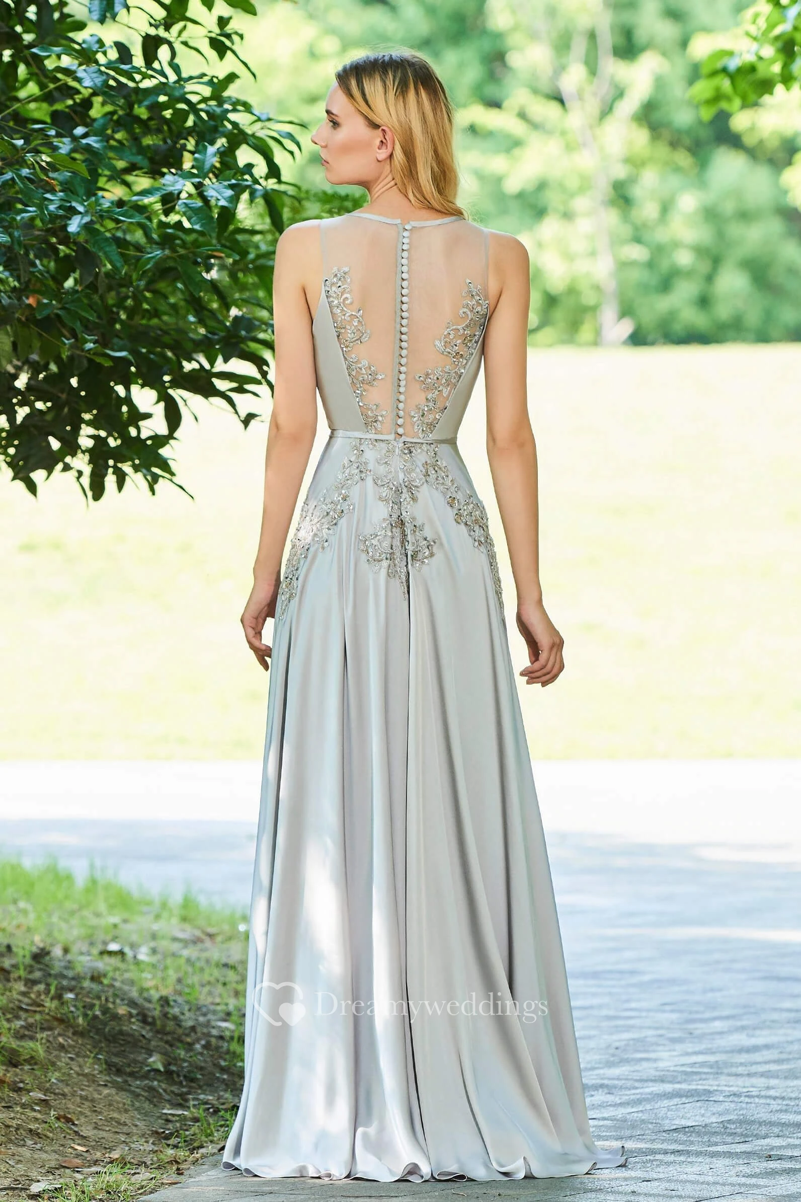 Appliqued Sleeveless Elegant Chiffon Button Back Prom Gown With Beading