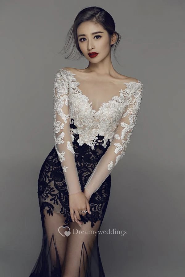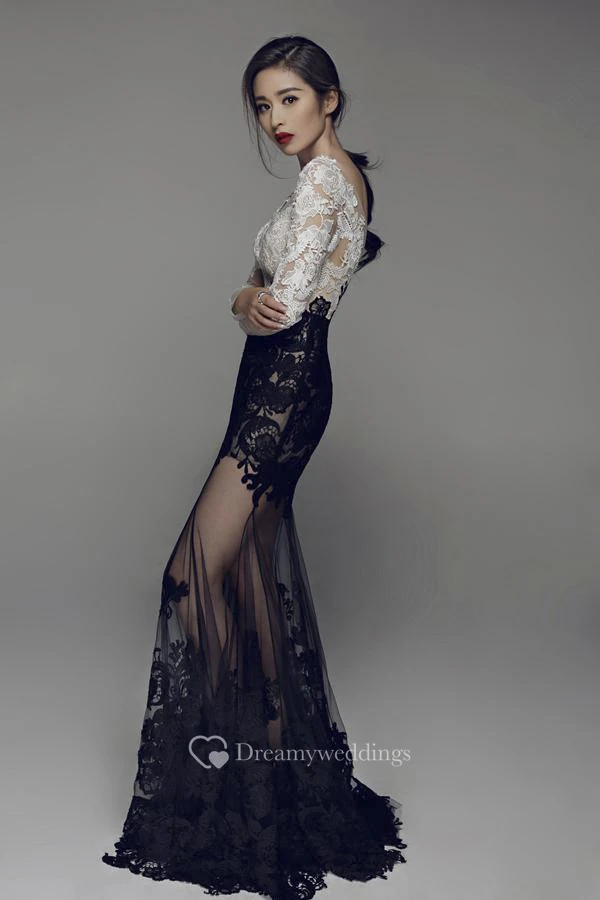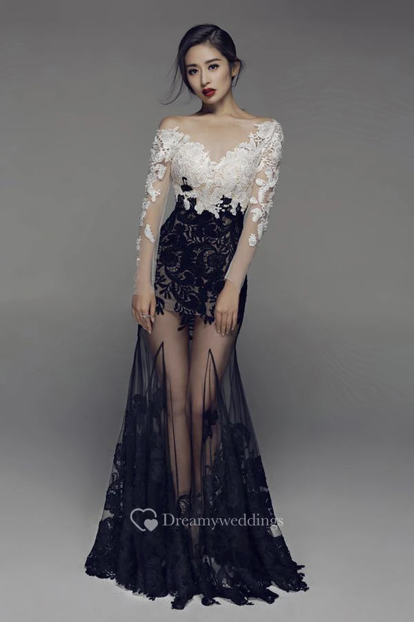 Appliqued Two Tune Sexy Mermaid Illusion Long Sleeve Dress