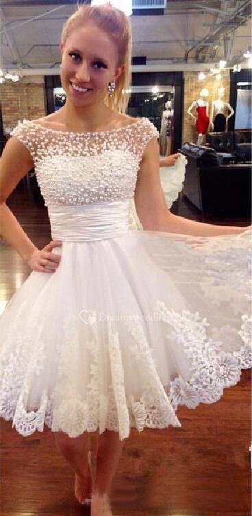Appliques Summer Beach Vintage Sheer neck Short Sleeves Wedding Dress