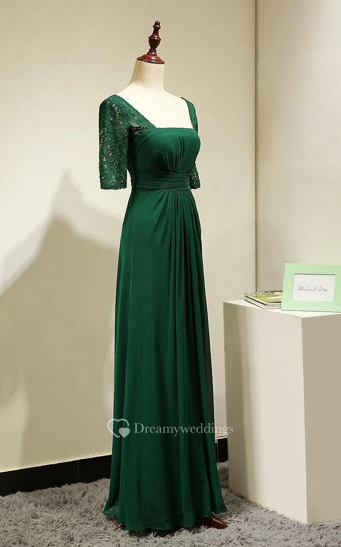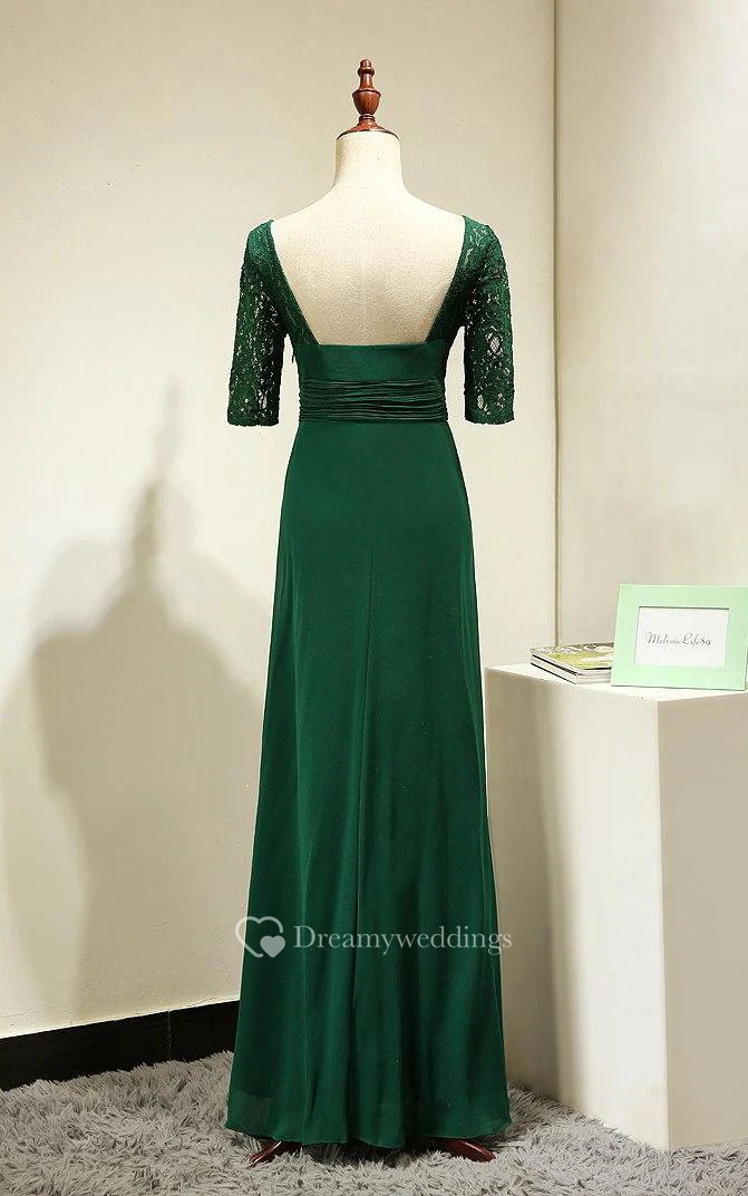 Backless Lace Half Sleeve Pleated A-line Chiffon Long Dress Emerald Green