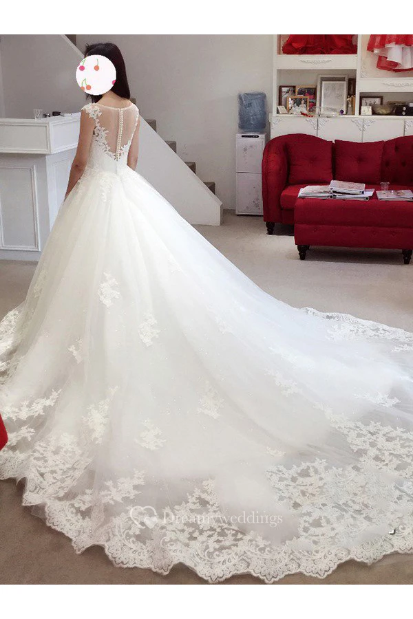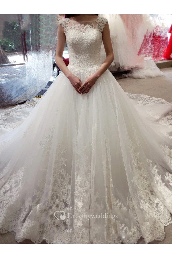 Ball Gown Cap Sleeve Bateau Applique Court Train Lace Tulle Wedding Dresses