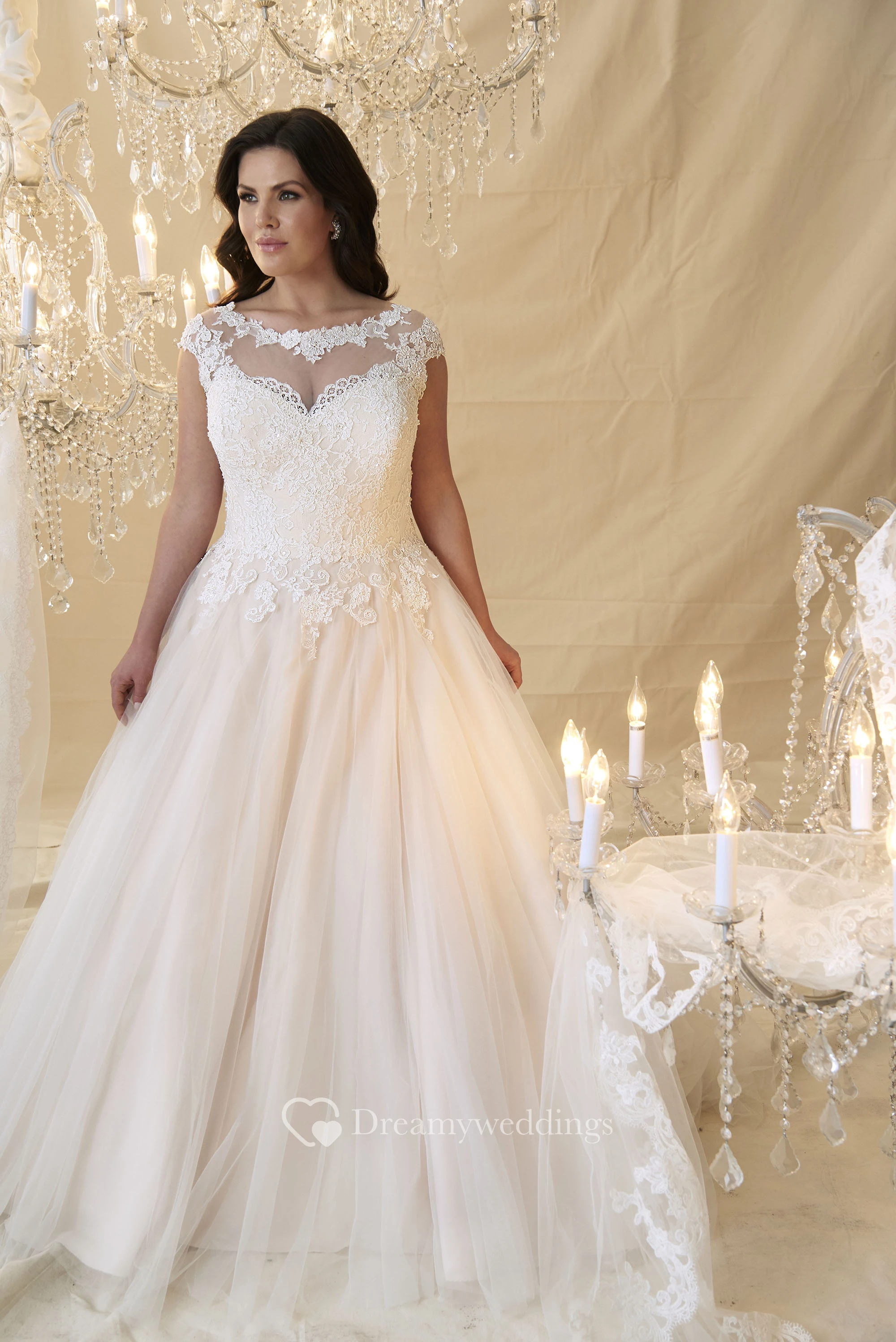 Ball Gown Cap-Sleeve Scoop-Neck Lace&Tulle Plus Size Wedding Dress With Keyhole