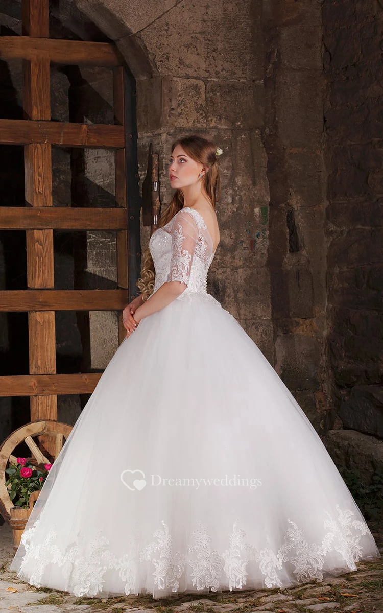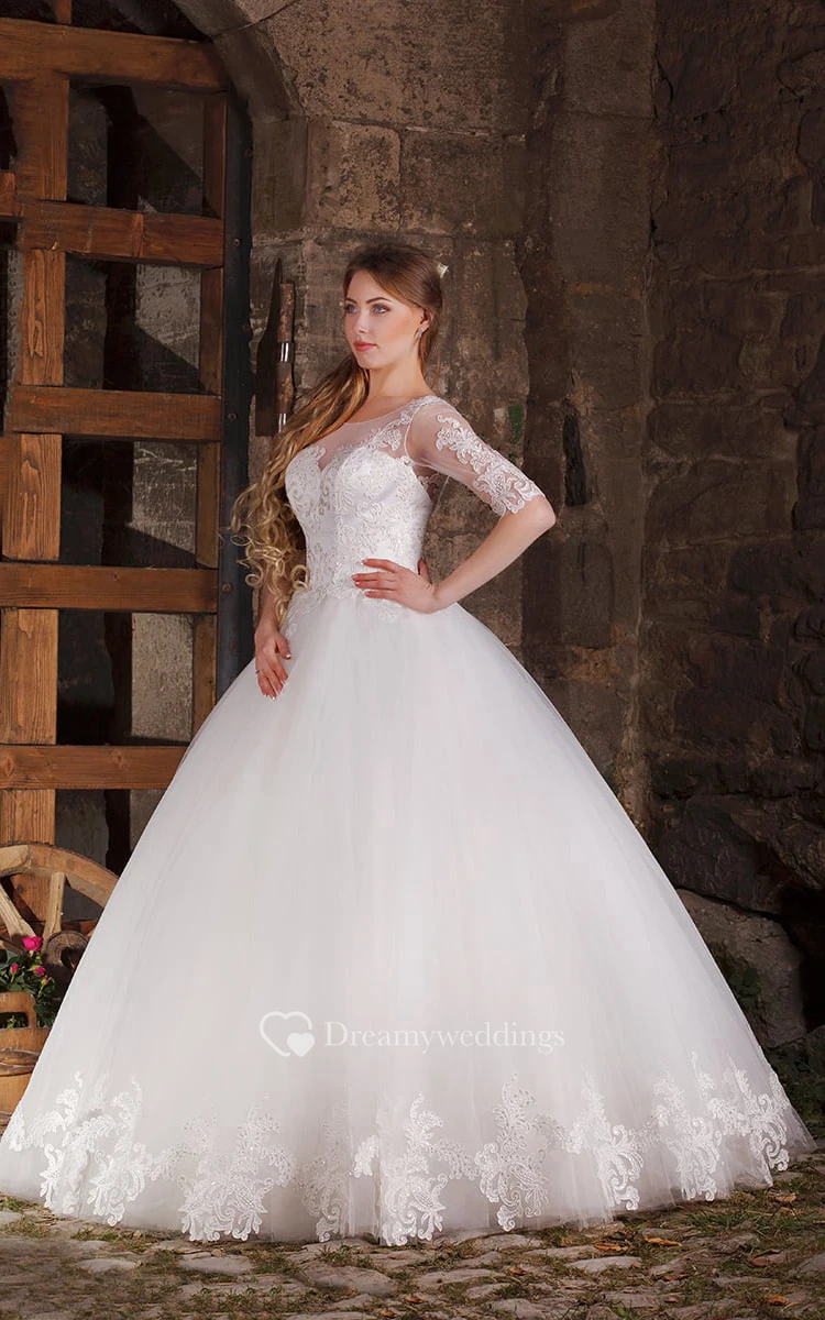 Ball Gown Floor-length Half Sleeve V Back Bateau Appliques Tulle Dres