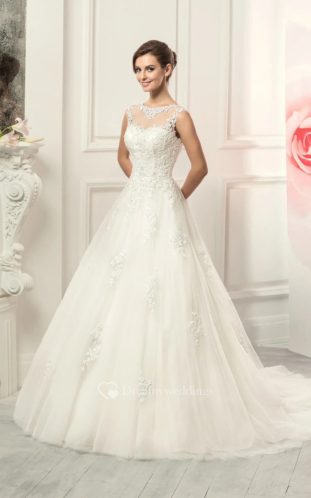 Ball Gown Floor-Length Jewel Sleeveless Illusion Lace Tulle Dress With Appliques