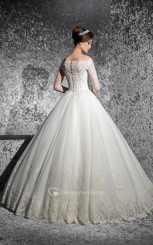 Ball Gown Floor-Length Off-The-Shoulder Long-Sleeve Illusion Lace Dress With Appliques And Beading