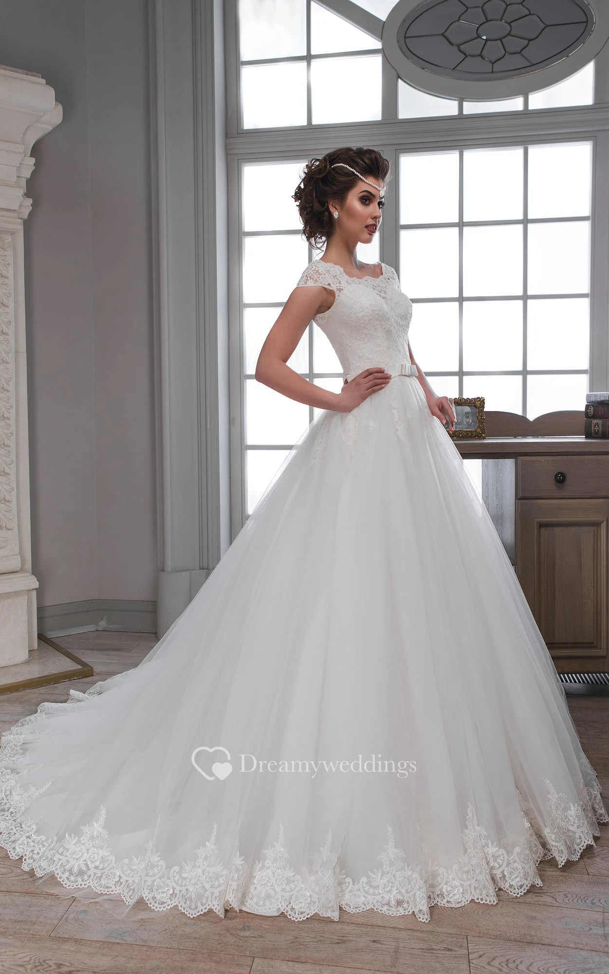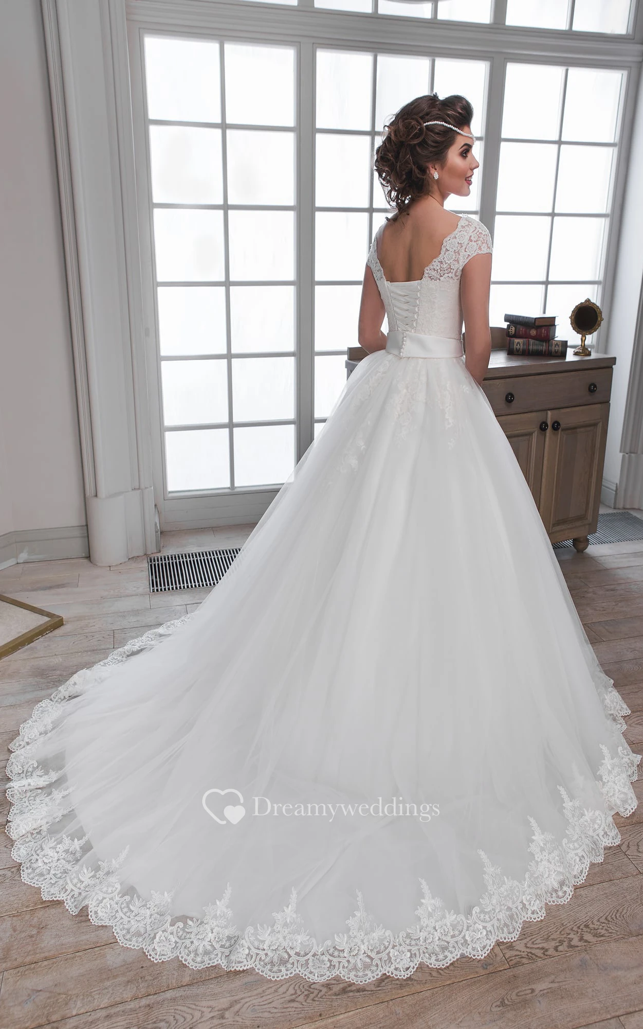 Ball Gown Floor-Length Scoop Cap-Sleeve Corset-Back Tulle Lace Dress