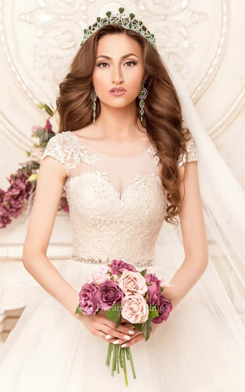 Ball Gown Floor-Length Scoop Cap-Sleeve Low-V-Back Tulle Dress With Appliques And Waist Jewellery