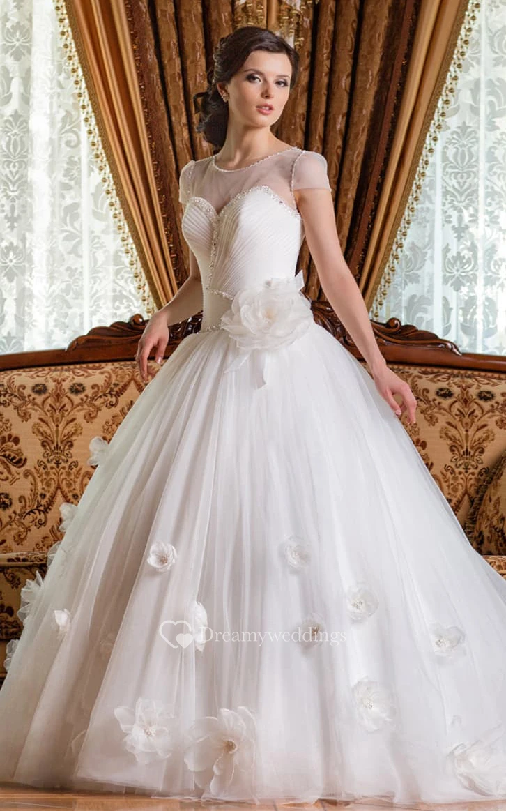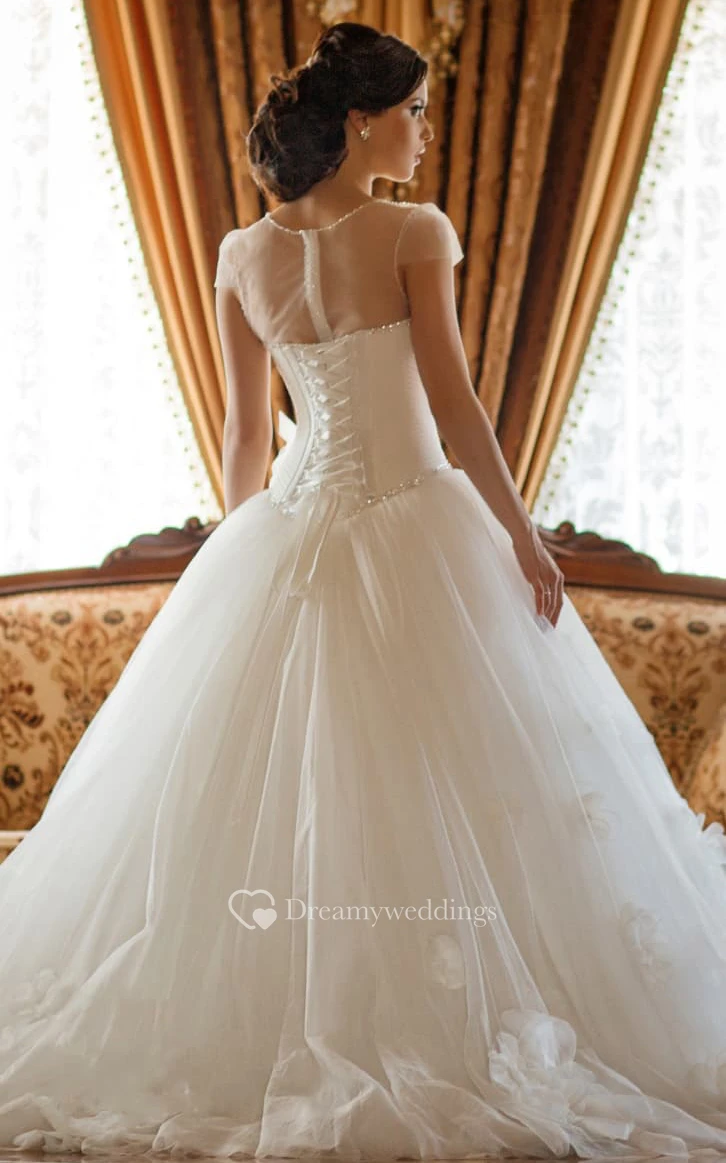 Ball Gown Floor-Length Scoop Short-Sleeve Corset-Back Tulle Dress With Flower And Beading