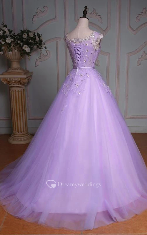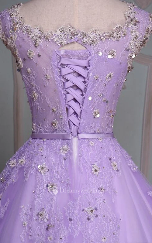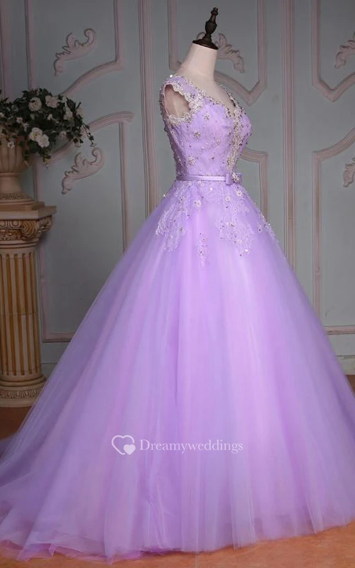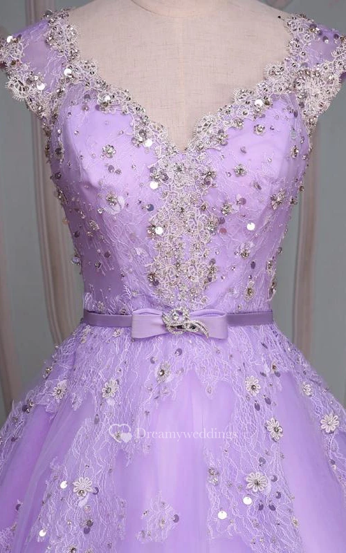 Ball Gown Floor-Length V-Neck Bell Cap Beading Flower Corset Back Tulle Lace Sequins Dress