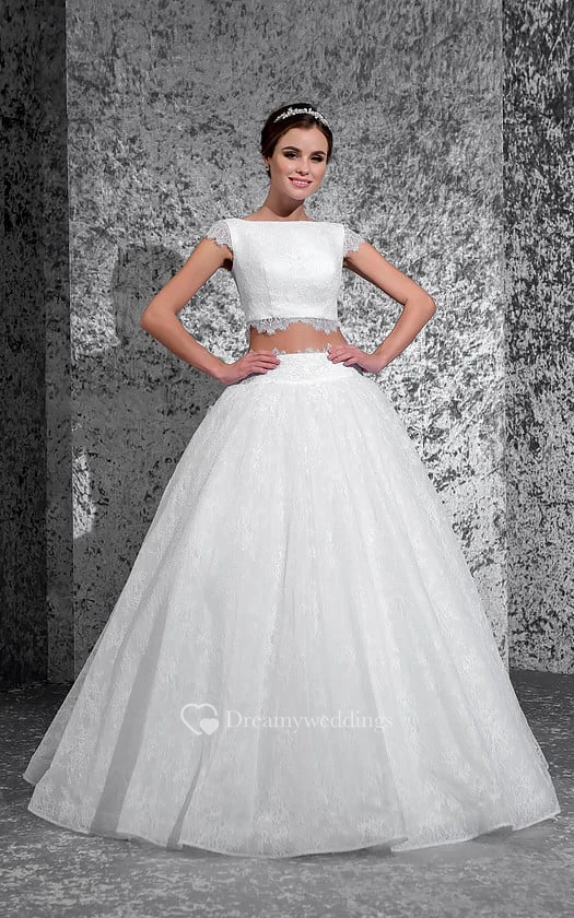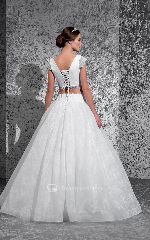 Ball Gown Long Bateau Cap-Sleeve Lace-Up Lace Dress