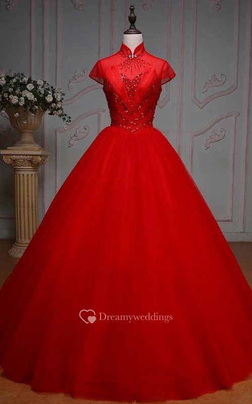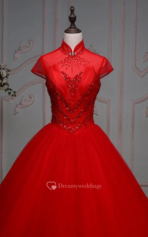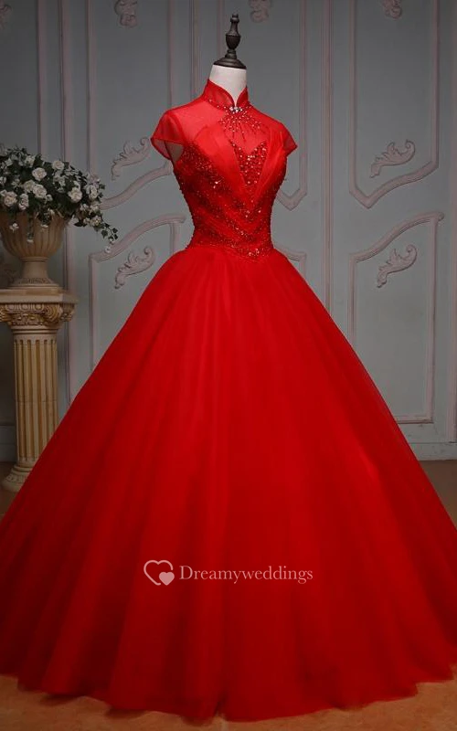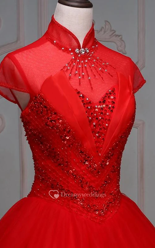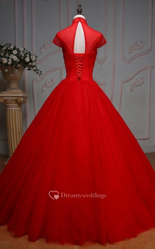 Ball Gown Long High Neck Bell Cap Pleats Beading Lace-Up Back Tulle Lace Dress