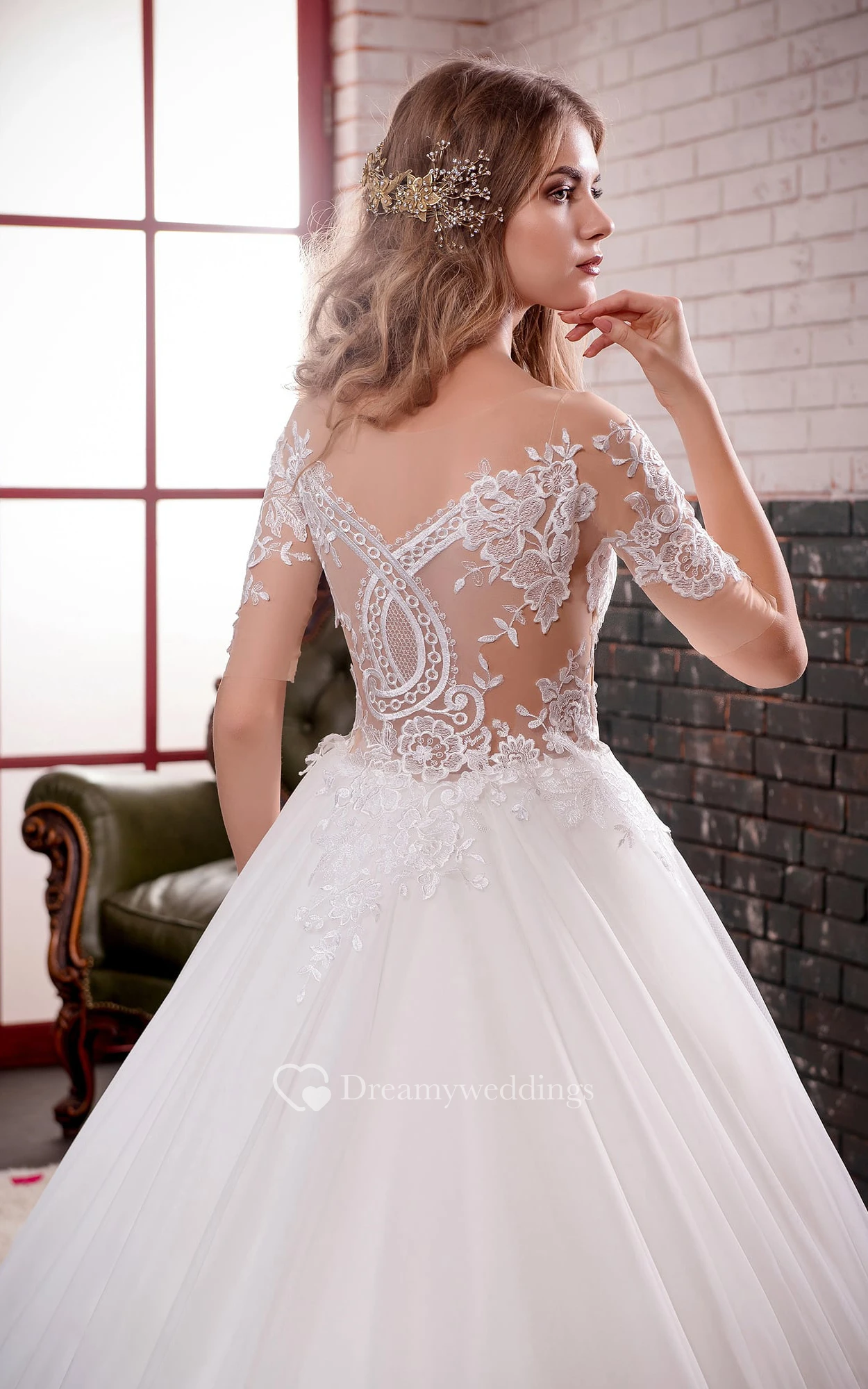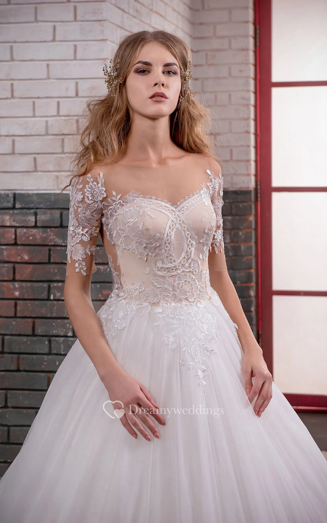 Ball Gown Long Off-The-Shoulder Short-Sleeve Illusion Lace Dress With Appliques And Pleats